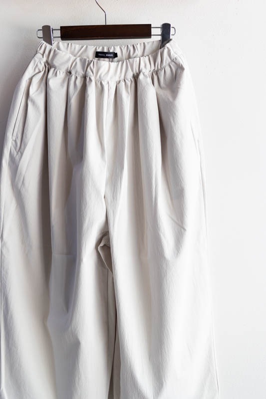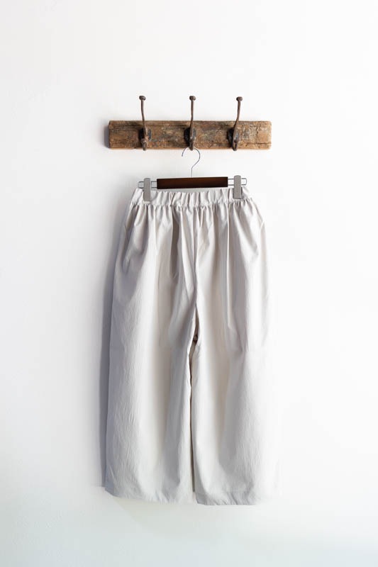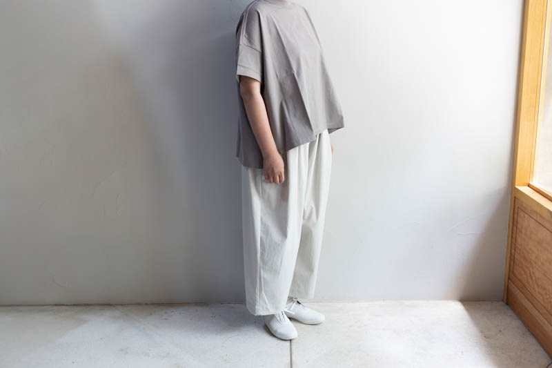 ウエストゴムと紐のイージーパンツ仕様で、腰回りにギャザーを入れてボリュームを持たせながらも、