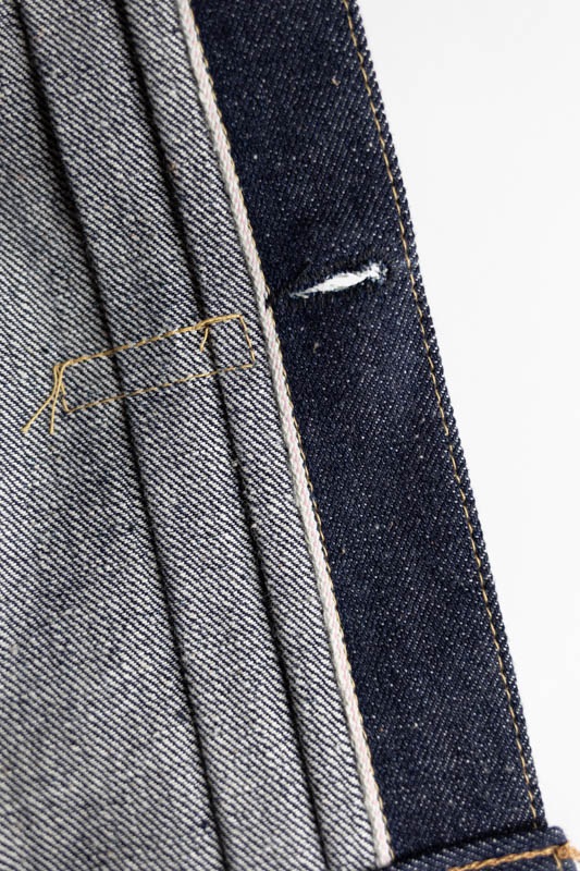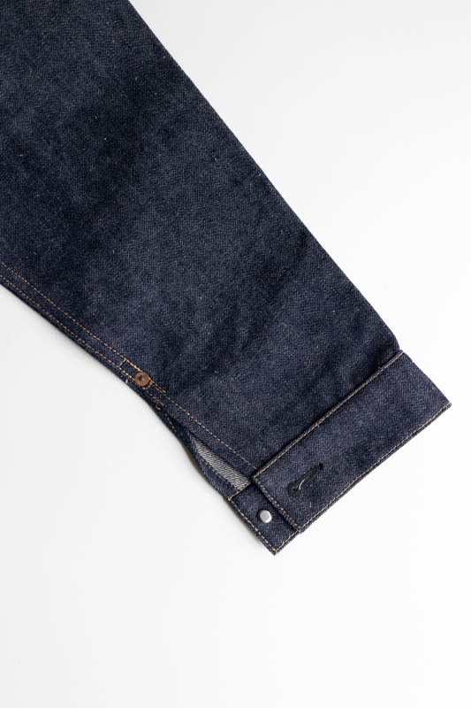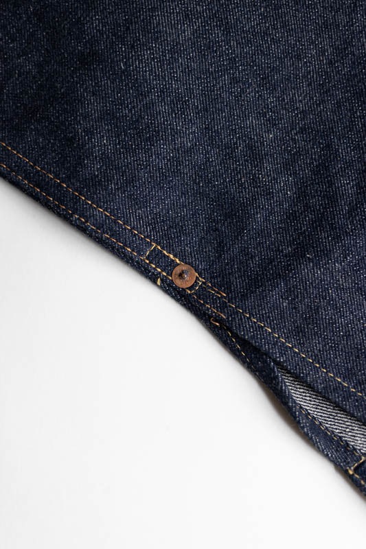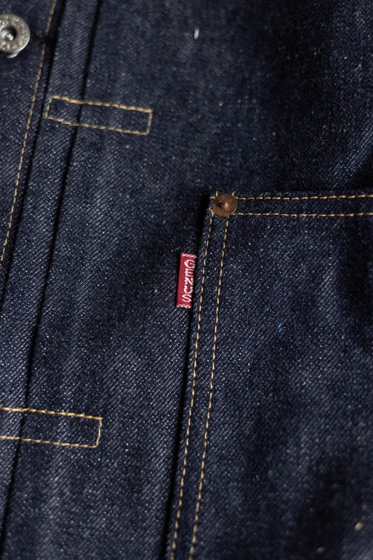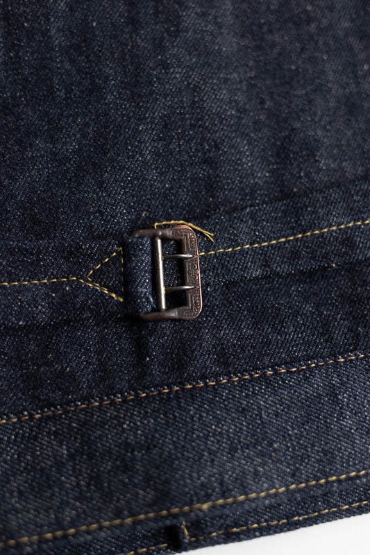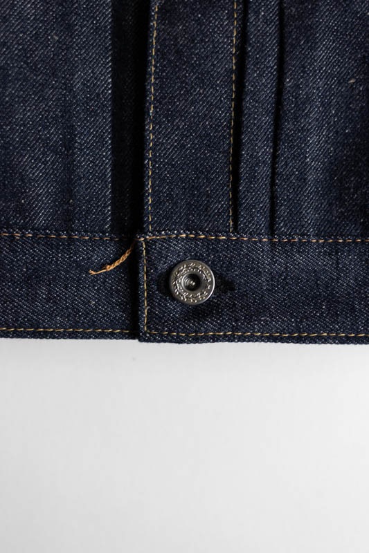 デニム生地は1930年代に使用されていたものではなく、既に供給が始まっていた大戦時の厚手のデニムを使用しながらも、ボタン数、胸のフラップポケット等、本来は物資統制で省略されるはずの各ディテールや縫製仕様がそのまま活きているというディテールを踏襲。