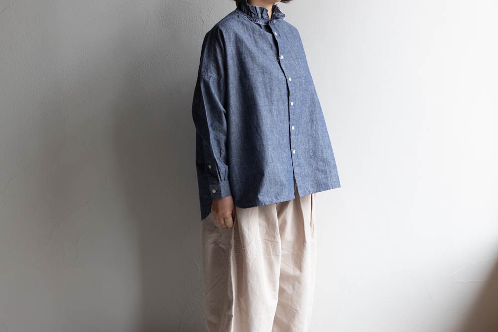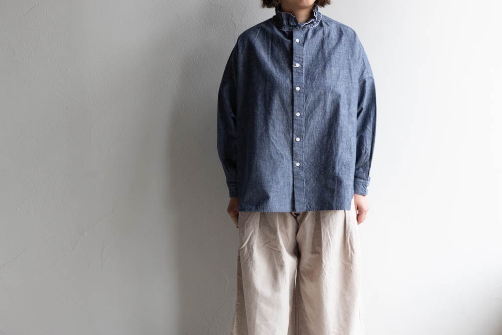 こちらはフリルカラーが特徴のシャツでゆとりのある着用感。
