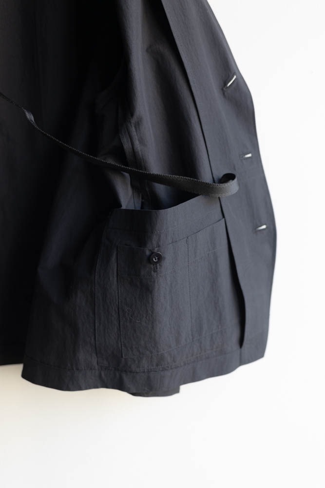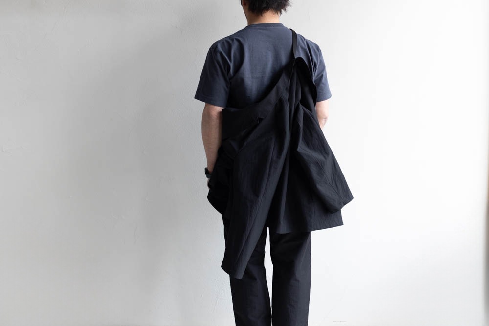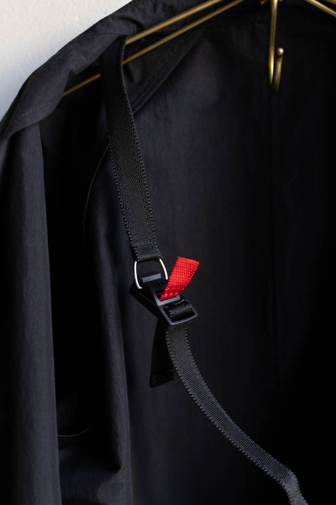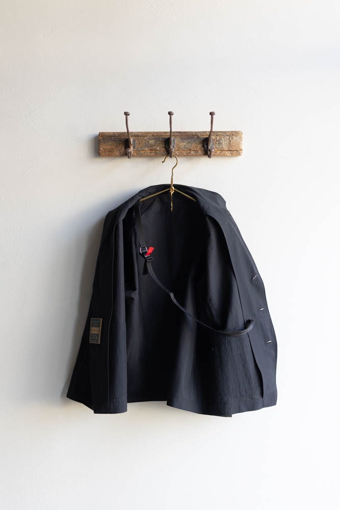 内側に施されたショルダーストラップは脱いだ時に手が開くよう肩がけできるようになっています。