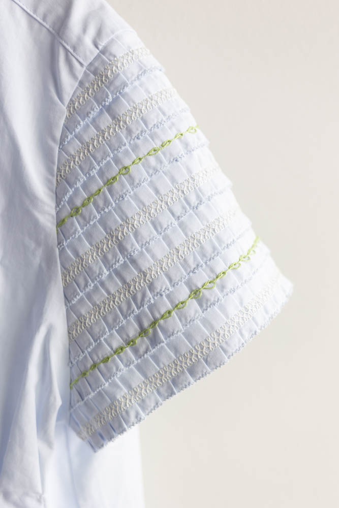 袖と衿に、特殊ミシンを使用してプリーツ加工+ステッチを施したテープを作り、