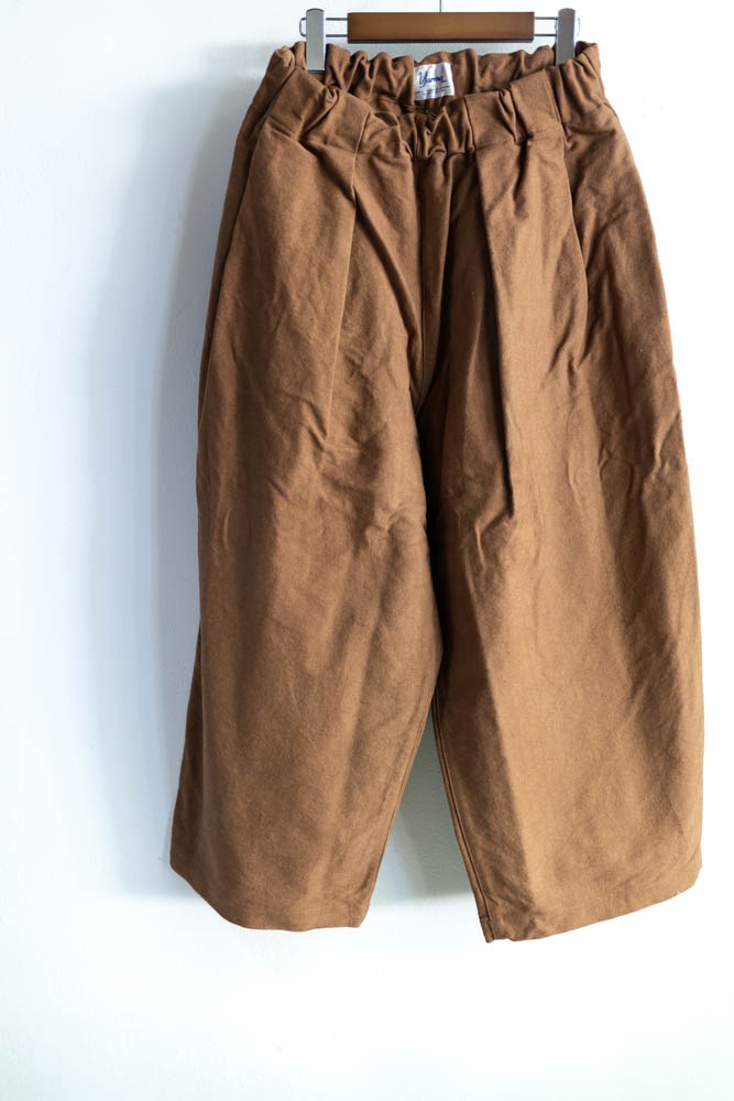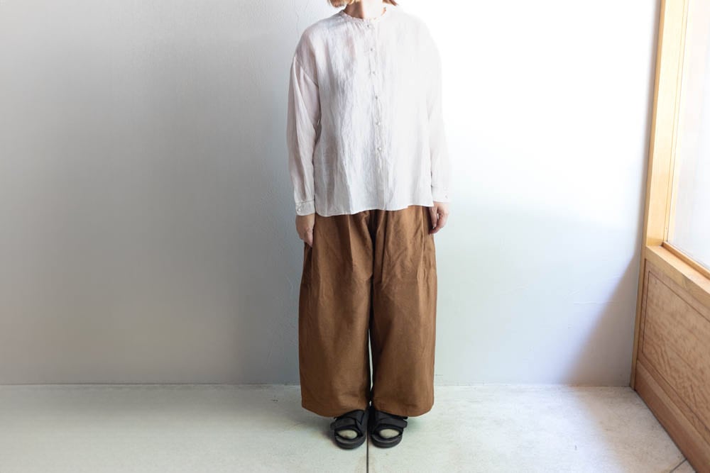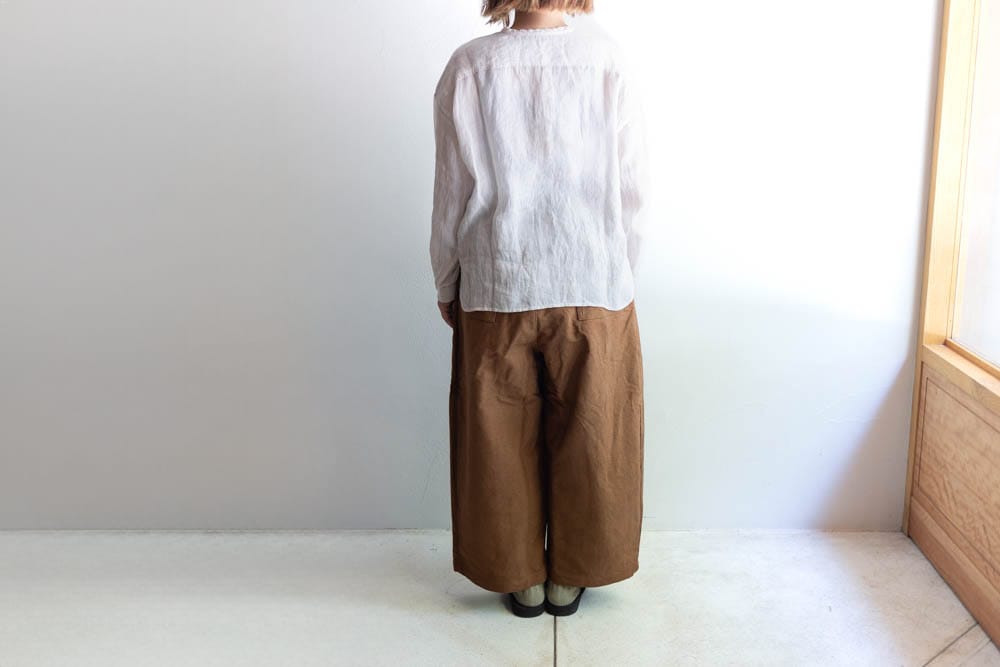 天然染料を使用しており、手染めのようなムラ感も相まって 穿き込むごとに風合いが増していくとても良い生地です。 ワイドなシルエットが特徴でウエストはゴムと紐のイージーパンツ仕様。 シンプルなカットソーや、女性らしいブラウスなどとの相性も良い1着です。