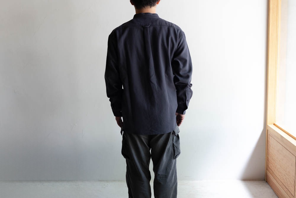 すっきりとしたバンドカラー仕様で首まわりももたつかず、