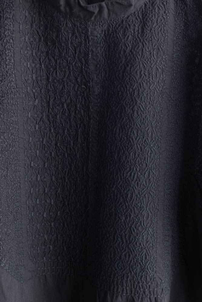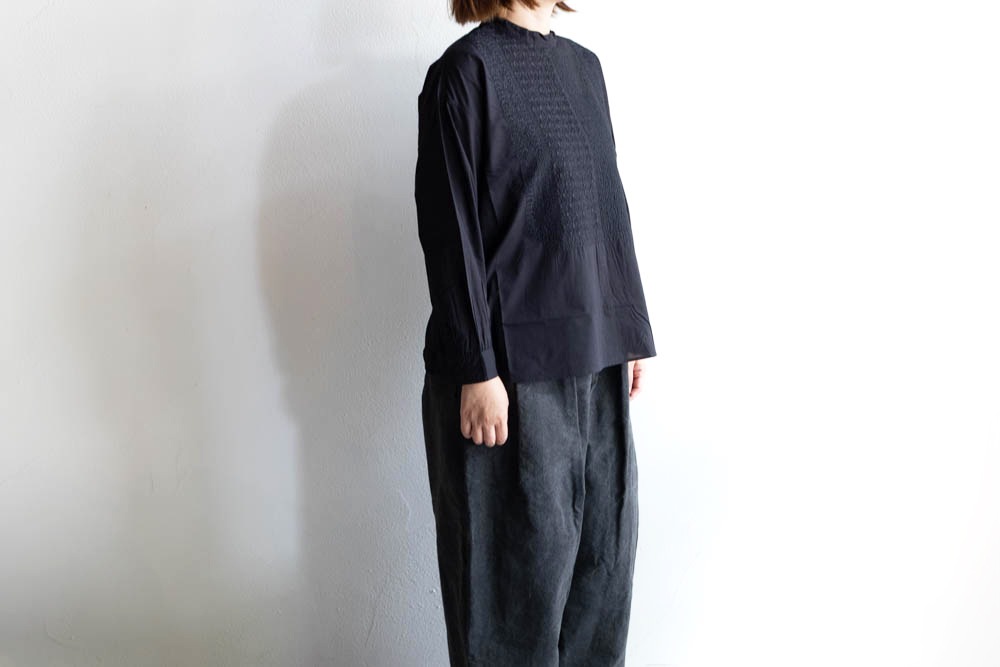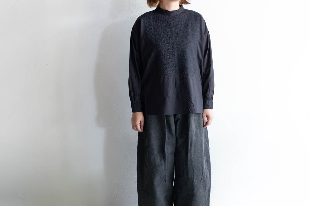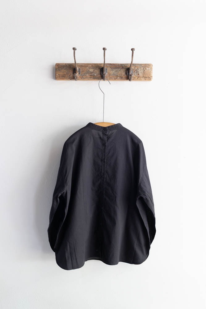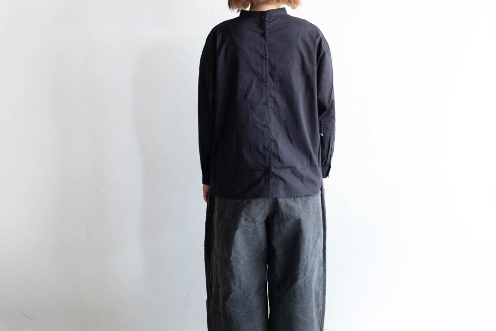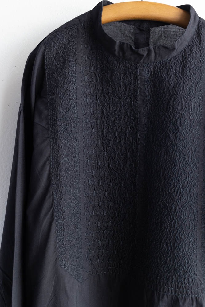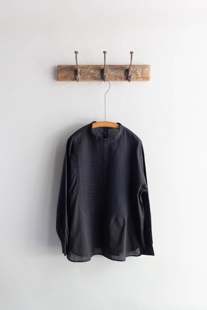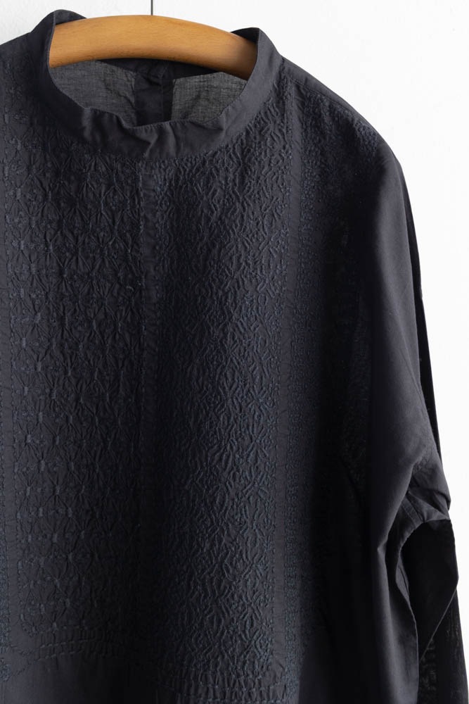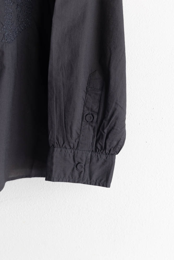 maison de soil メゾンドソイル | 60'S ORGANIC CAMBRIC BACK OPENING STAND COLLAR EMB SHIRT Col : BLACK