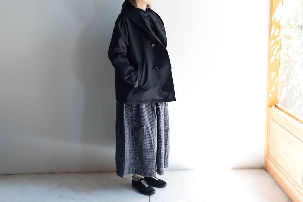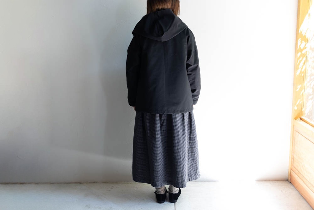 シンプルですが大きめのフードと、アシンメトリーなフロントの合わせがポイント。