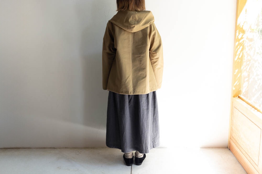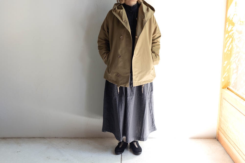 シンプルですが大きめのフードと、アシンメトリーなフロントの合わせがポイント。
