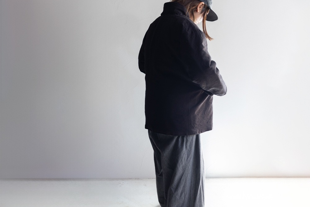 襟を立てて着ても、フロントを開けて着ても、雰囲気よくまとまるデザインです。